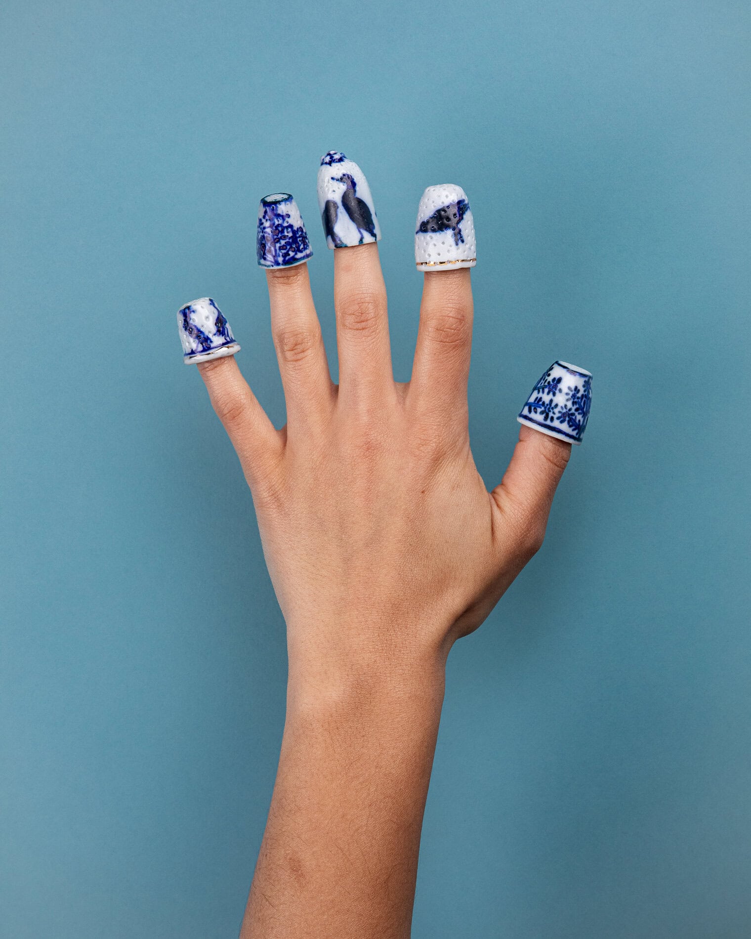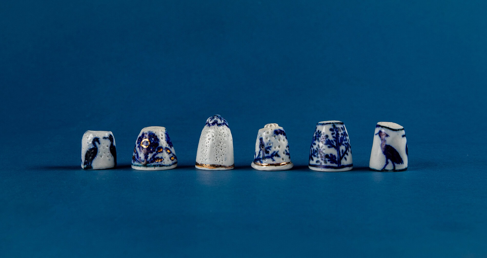 I’m sitting at my kitchen table, hand-sewing project in my lap. My right middle finger is capped snugly in a white, porcelain thimble. It feels cool to the touch. Winter sunlight streams in, and the thimble responds with a reflective glow. I admire the hand-painted birds dancing around its perimeter, and how its purposeful texture cradles my needle. It is a one-of-a-kind heirloom thimble, part of a series made by artist Melissa Goldstein, for TATTER.