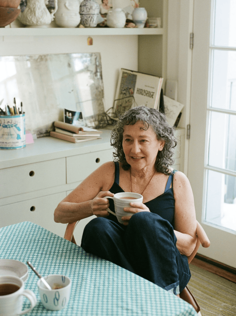 The artist’s large garden also factors in. Gardens prompt drawings of flowers, and lead to flower arranging—hence the vases. She also draws on the concept of gathering around a table. Gathering, eating, and drawing around a table has been a social constant for Melissa. She associates those moments with laughter and chatter, people getting up and sitting down. It’s a lively setting that animates the otherwise static tableware. Painted birds landing and taking flight from the pieces pay homage to that ritual.