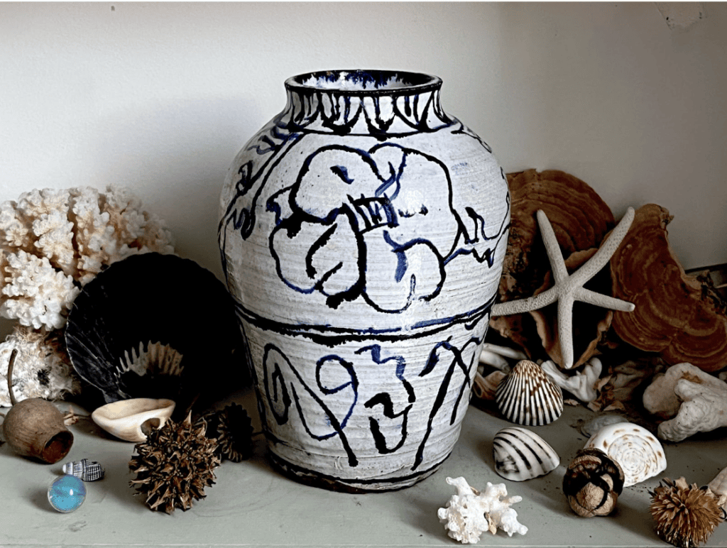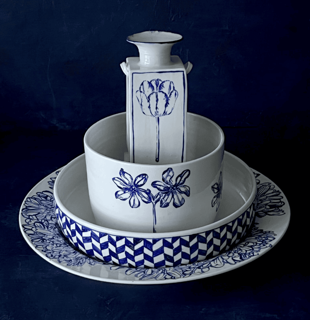 Stacked porcelain vessels of varying shapes, embellished with fine-lined, cobalt drawings of birds, flowers, and geometric patterns, are central to artist Melissa Goldstein’s ceramic practice: Mg by hand.