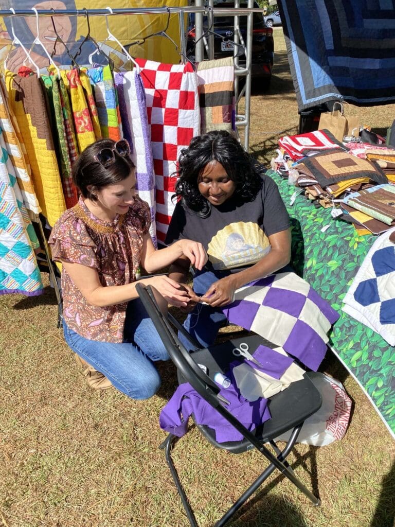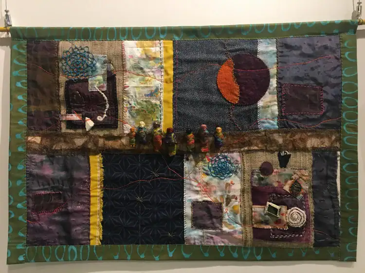 RACHEL: I love that textiles can be soothing. Tactile comfort goes deep with us– think of a child’s blankie! I love that cloth is a cultural artifact that speaks of heritage and belonging. The scraps that we use carry visceral memories of people and places. Sometimes people make story cloths out of the clothing of a lost or disappeared loved one. There is such profound intimacy there. It does go to a place where words cannot.