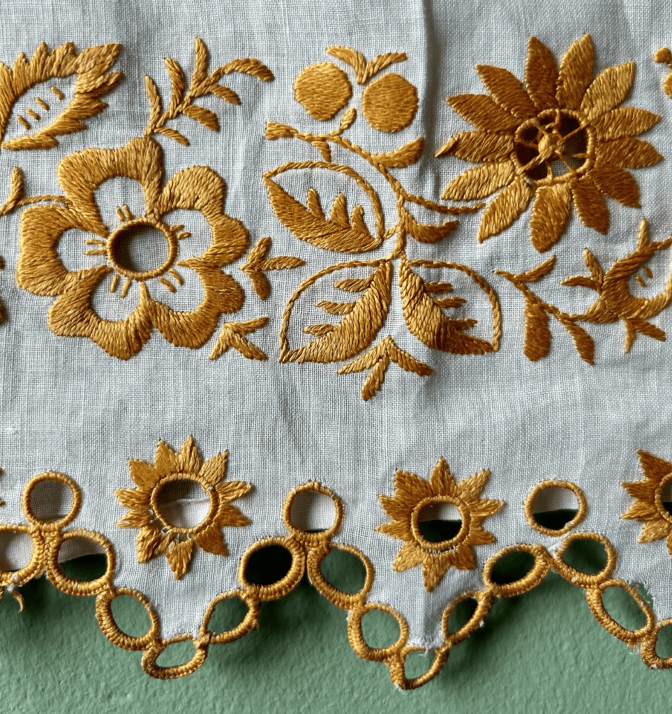 In this class, we’ll look at the use of eyelets in Czech and Slovak traditional clothing from the 1800s– think puffed sleeves, caps, and aprons! Some historians date the first eyelets in Eastern Europe back as early as the 1600s.