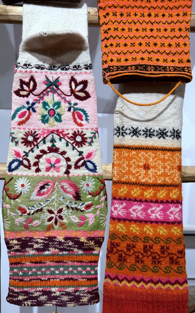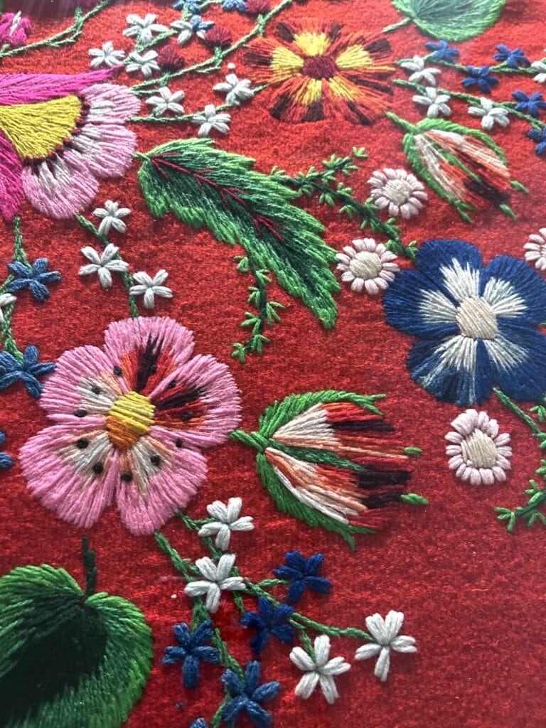 Originating on Muhu Island located off Estonia’s western coast, Muhu embroidery is known for its bold floral motifs, stylized birds, and swirling vines, stitched in bright pinks, oranges, and greens on black wool or dark fabric. Vivid designs often adorned festive clothing, mittens, slippers, and home textiles, serving both decorative and symbolic purposes. In the 19th and early 20th centuries, the embroidery formed a crucial part of a woman’s dowry and personal wardrobe, showcasing her technical ability and taste.
