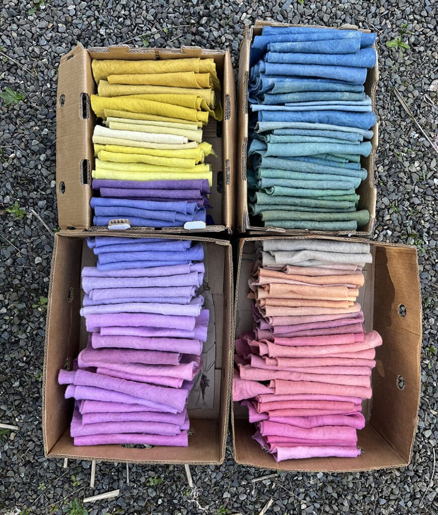 My studio, the home of Kata Golda, is nestled snugly in the small, mossy seaside town of Port Townsend, Washington. Much of the inspiration for my work comes from the subtle details in the natural world, where nothing is straight and nothing is perfect. I try to begin each day with a walk in the woods or time in my dye garden. The flow of my day shifts between the repetitive production of filling orders, scheming and sketching new ideas for my line, dyeing fabric, and stitching something simply for pleasure. The rhythm of my creative endeavors is punctuated by domestic arts— cooking, gardening, mending, and keeping a tidy and organized space. I find that chores clear my head, structure my day, and focus my craft. I love the sense of order and accomplishment from a thoughtfully planned routine. I almost always have a hand-bound journal and sharp pencil within reach. It is a practice that I started over twenty years ago to make space for my artistic, wandering ideas while keeping my methodical mind at peace. I work with sustainable fabrics, and I love growing a dye garden and coaxing color from plants in my home dye studio. I create slowly and with intention and try to use up every little scrap of fabric. The things I make take time. I find immense joy in sharing my love of hand work with others through free sewing tutorials, DIY kits, and carefully curated bundles of plant-dyed fabrics. Taking the time to slow down and make something with your hands using quality materials is such a gift, and I feel so lucky to do this work.