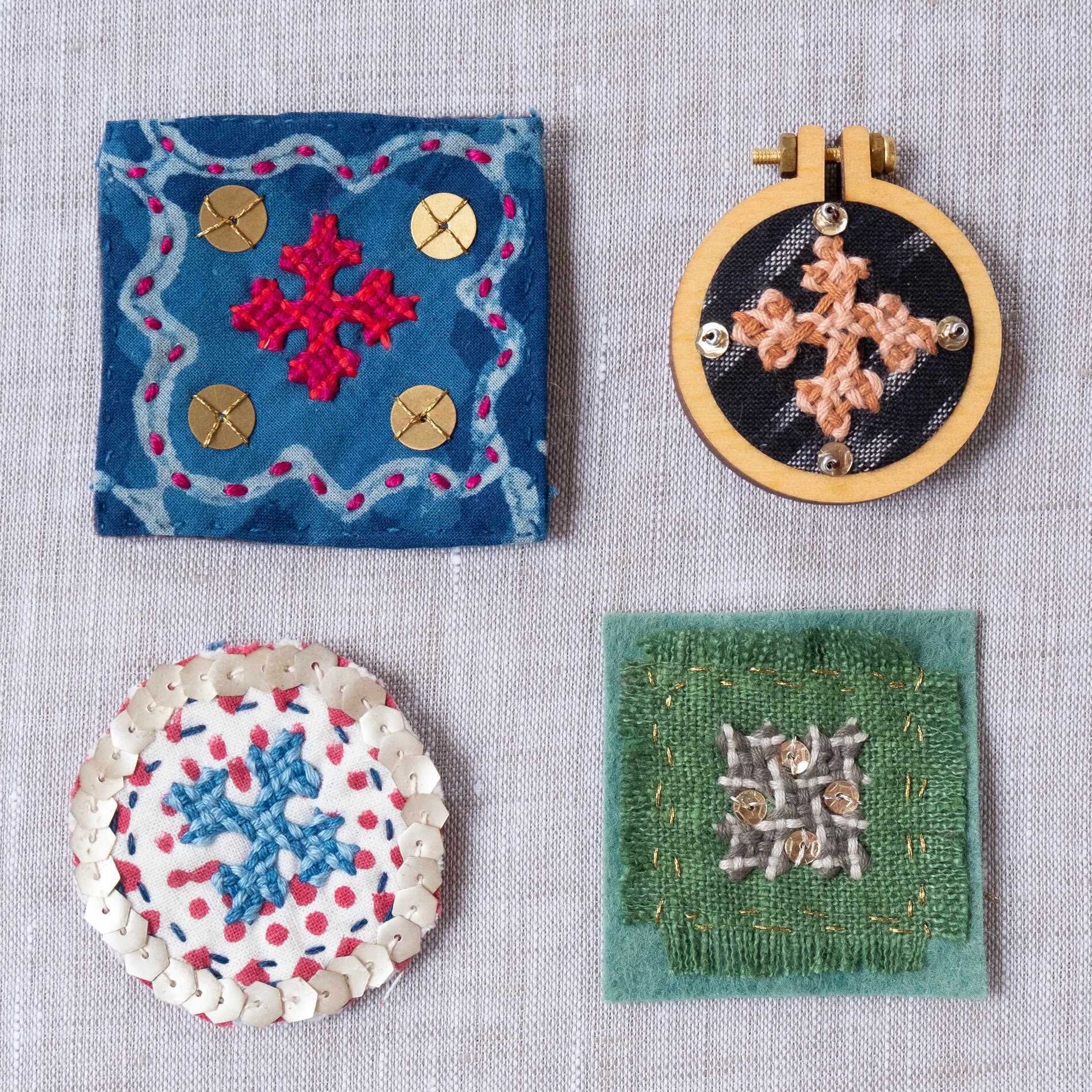 Inspired by an antique textile found while traveling in India, this class will lead students though the process of laying down a foundation using herringbone stitches, followed by an intricate pattern of interlacing.