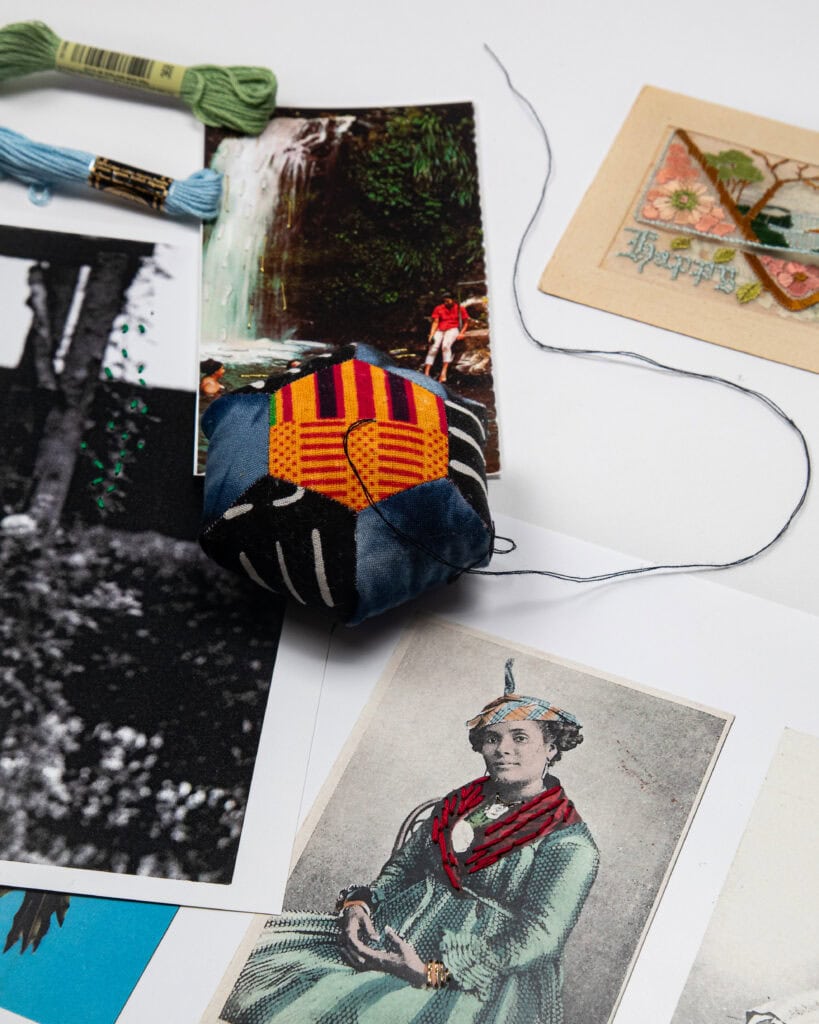 With Stitch Griot, she blends words and thread into tactile paper and textile pieces that invite reflection and rest.