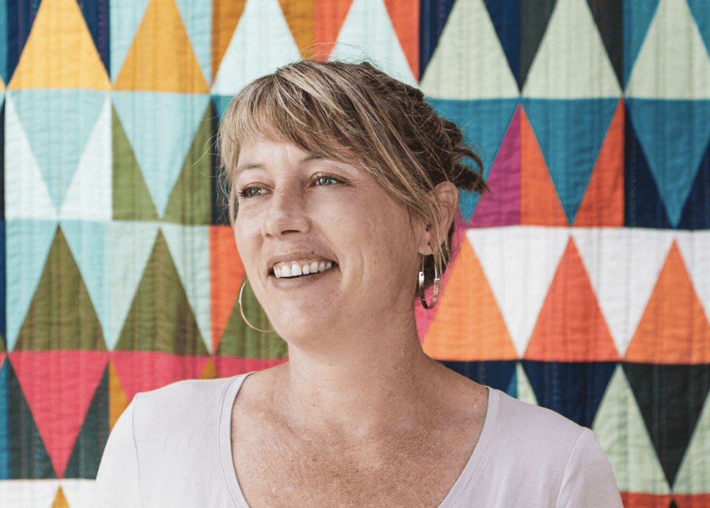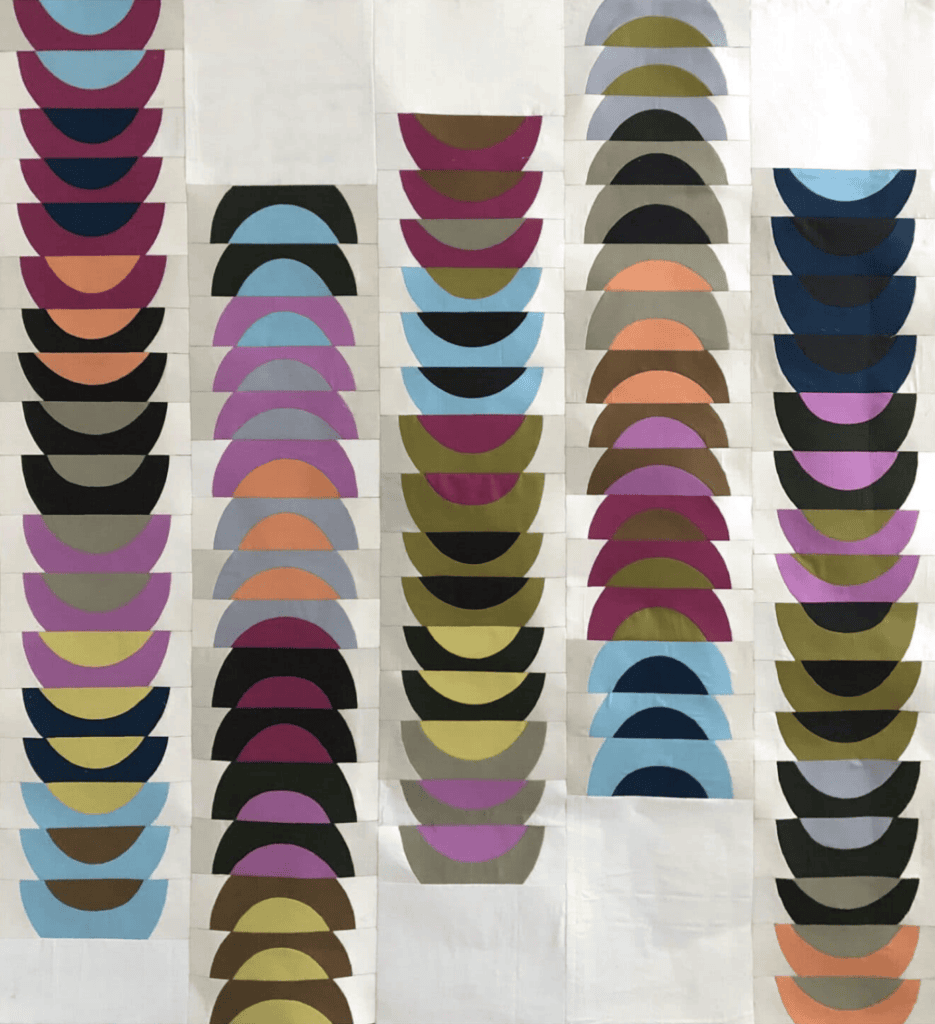 She draws a lot of inspiration from the simple, bold geometry of antique quilts, the gorgeous, bright colors from textiles around the world, and the freedom and spontaneity found in unconventional and improvisational quilts. When she looks at her current work, she sees all 3 of these aspects represented. She likes to use simple geometry, complex color interaction, and find the line that exists somewhere between harmony and discord.